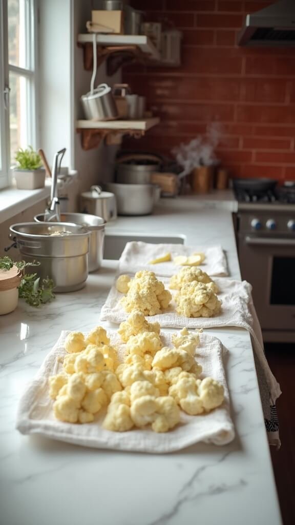 - Drain and dry the cauliflower thoroughly. This step is crucial – I lay the florets on clean kitchen towels and gently pat them dry. Excess moisture is the enemy of a perfect gratin.