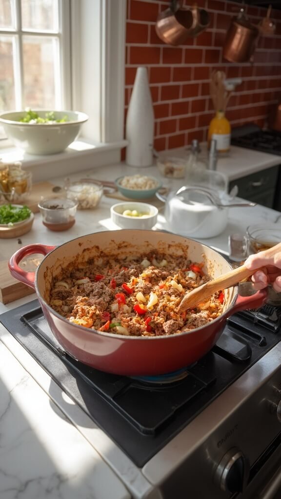 - Brown the beef in your Dutch oven over medium-high heat, breaking it up with your spoon as it cooks. This takes about 6-8 minutes – you want proper caramelization for maximum flavor.