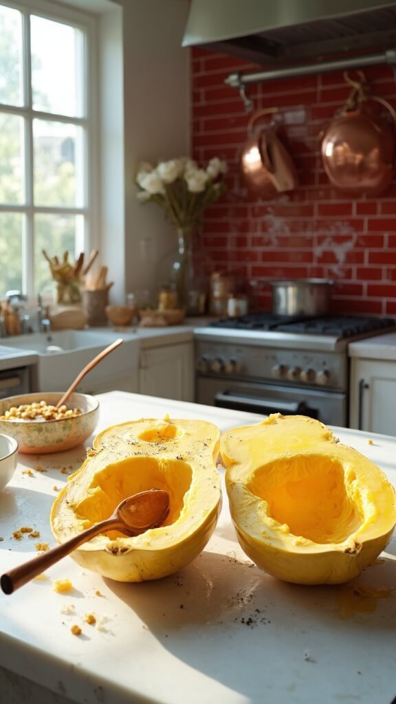Here’s the trick most people miss – pierce the whole squash with a knife in several spots first. This prevents any explosive surprises.