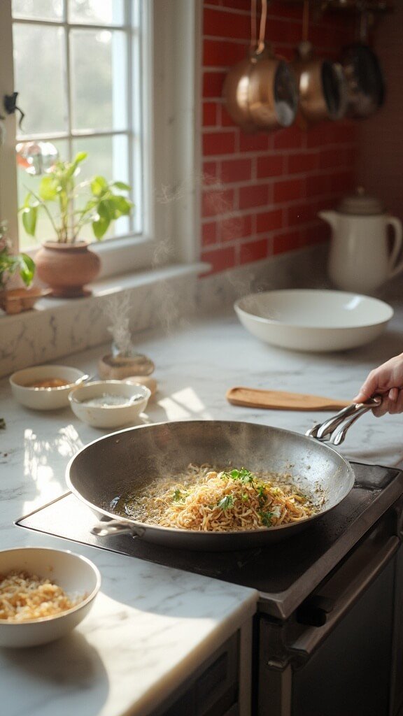 Heat sesame oil in your largest skillet over medium-high heat. Add minced garlic and ginger. Cook for 30-60 seconds until fragrant – don’t let them burn or you’ll taste bitterness.