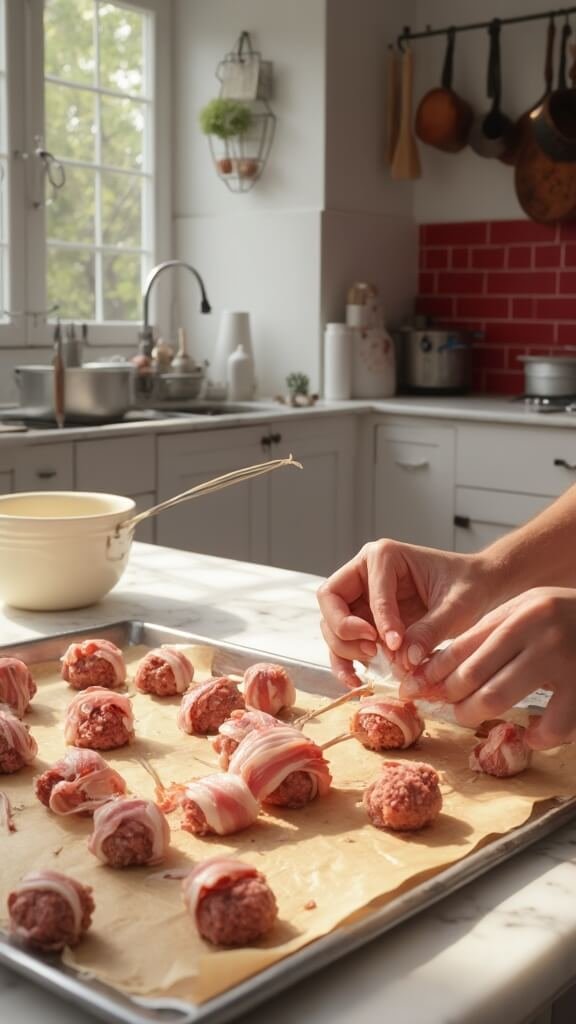 - Wrap each meatball with bacon. Take one half-slice of bacon and wrap it around each meatball. Secure with a toothpick pushed all the way through.