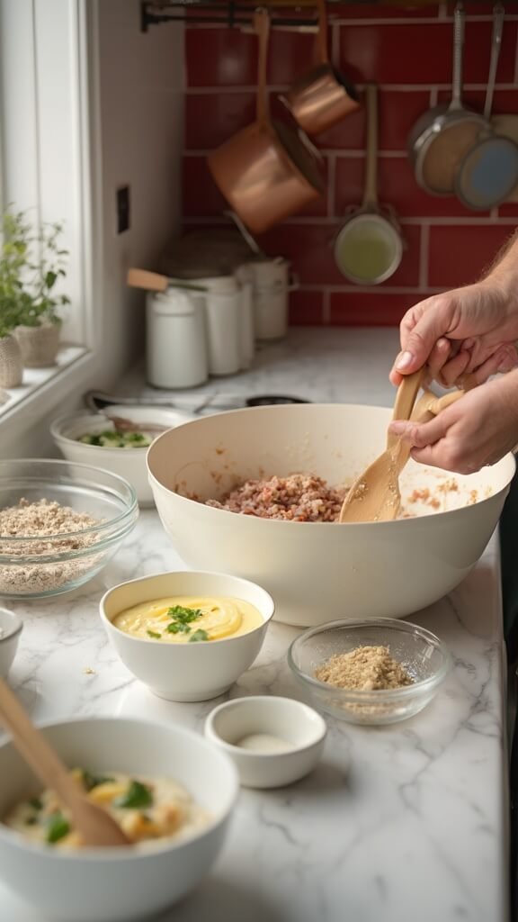 - Combine your meatball base. In the large bowl, gently mix ground pork, egg, almond flour, and all seasonings. Don’t overmix – this makes tough meatballs.