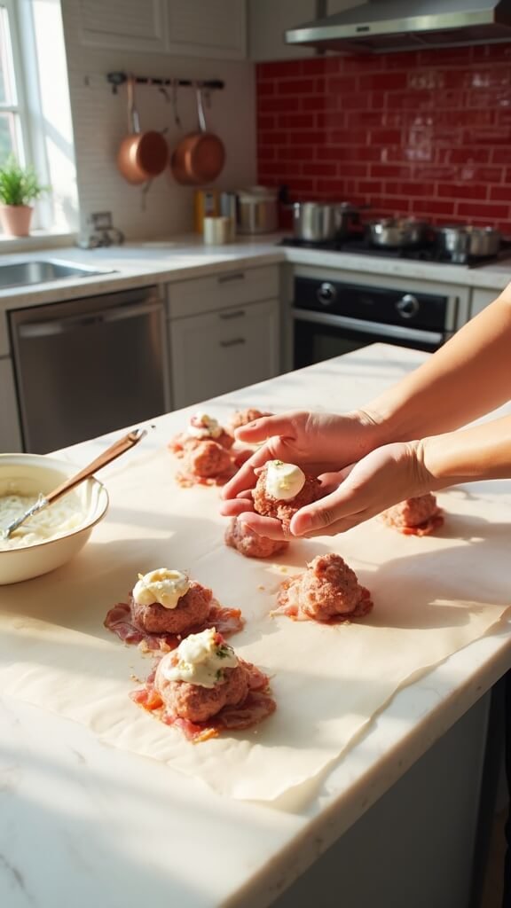 - Form the stuffed meatballs. Take about 2 tablespoons of meat mixture, flatten into a small patty in your palm. Add 1 teaspoon of cream cheese filling to the center. Carefully wrap the meat around the filling and roll into a ball. Repeat for all 18 meatballs.