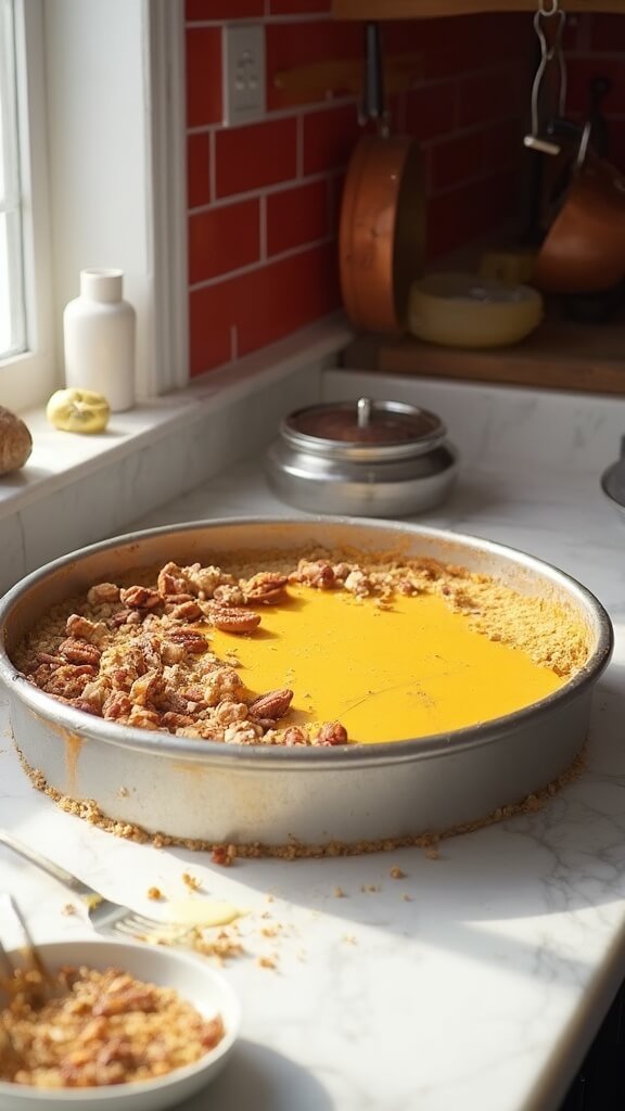 - Make your crumble topping. Use a fork to mix almond flour, pecans, cold butter pieces, brown erythritol, and cinnamon until it forms coarse crumbs.
