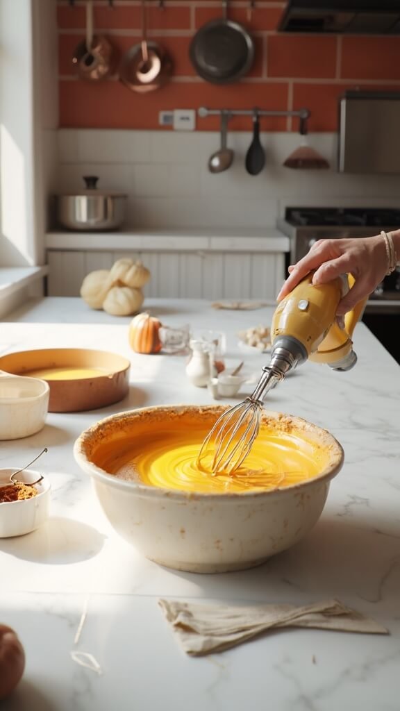 - Fold in pumpkin puree, pumpkin pie spice, and heavy cream until just combined. The mixture should be smooth and gorgeous orange.