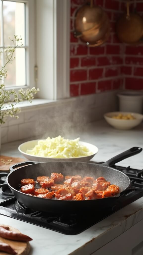 This keto smoked sausage and cabbage skillet turns humble pantry staples into pure comfort food magic. I’ve made this dish countless times when money was tight and time was shorter. What started as a “whatever’s left in the fridge” meal became my go-to recipe for busy weeknights.