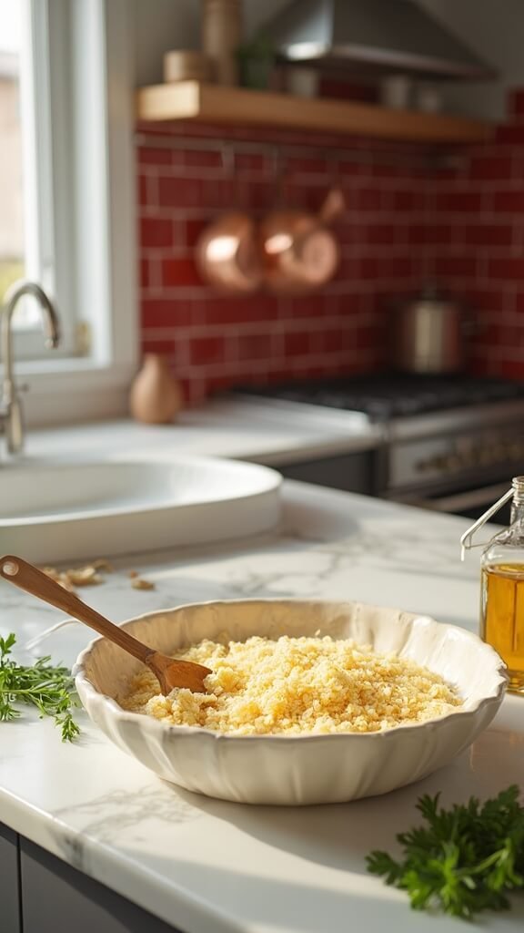 5. Drizzle olive oil into the mixture and stir until it looks like wet sand – it should hold together when squeezed.