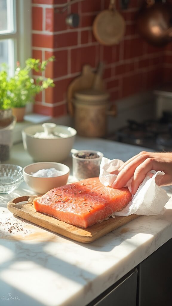 2. Pat the salmon completely dry with paper towels – this is non-negotiable for crispy crust success.
