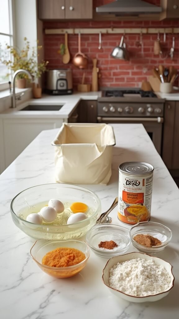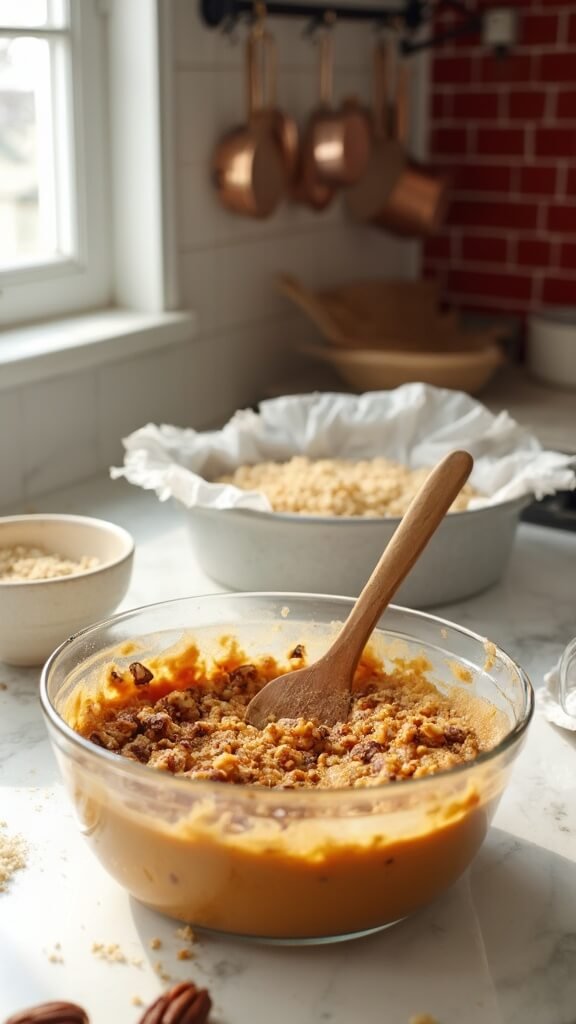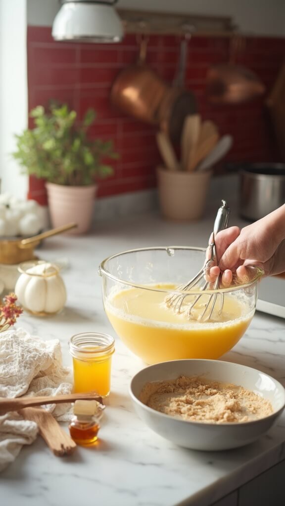 - Add pumpkin puree, melted butter, and vanilla to the egg mixture. Whisk until completely smooth.