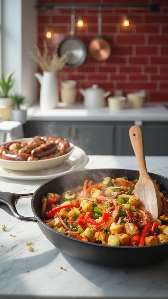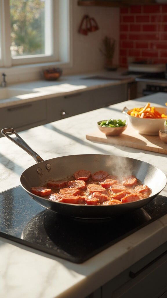 • Sausage releases fat – use it to cook your vegetables for extra flavor
