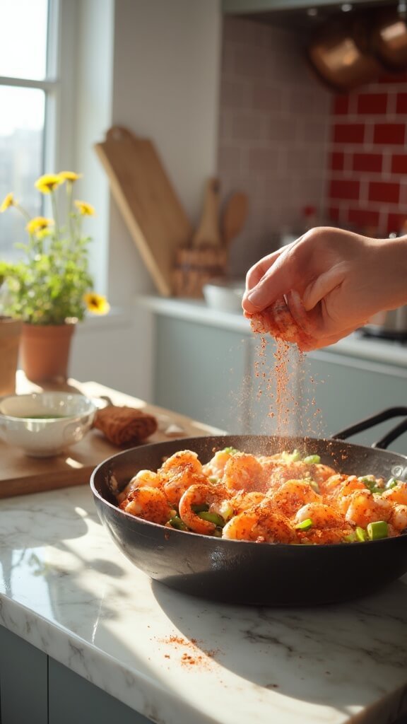 5. Sprinkle in Cajun seasoning, paprika, and cayenne.