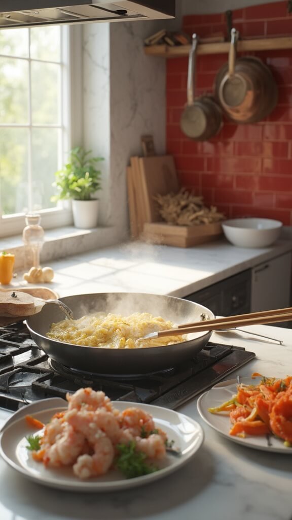 Add back your scrambled eggs and cooked shrimp. Gently toss everything together for 1 minute until heated through. Remove from heat immediately.