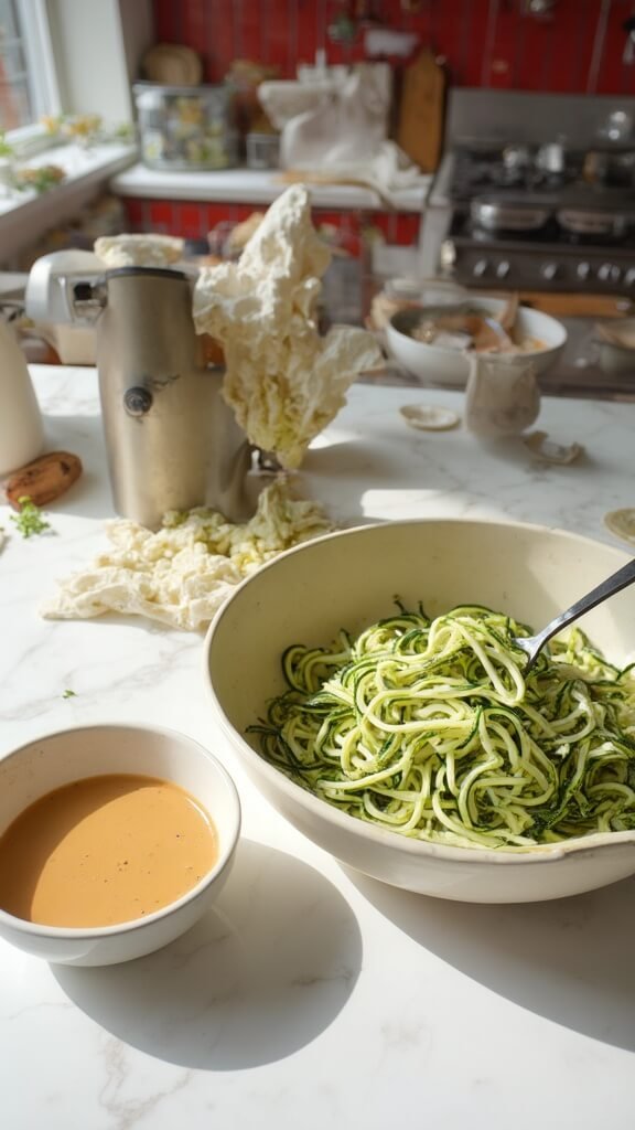 Spiralize your zucchini into noodle-like strands. Pat them dry with paper towels – this prevents watery pad thai. Critical tip: Don’t salt them ahead of time or they’ll release too much moisture.