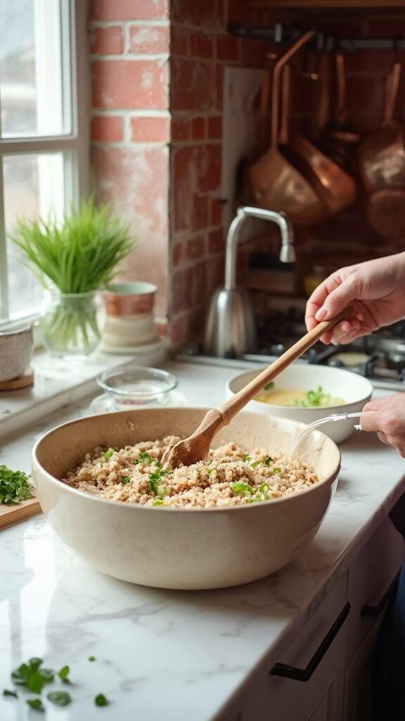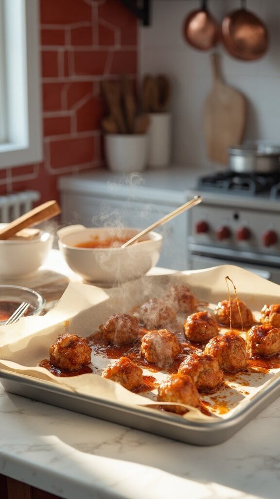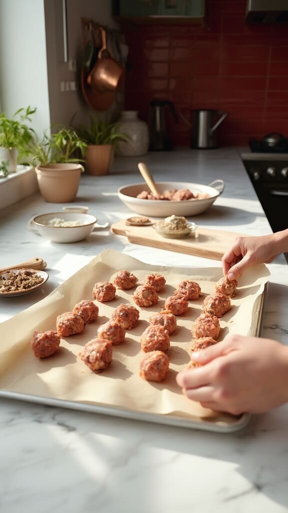 Don’t overwork this mixture – I learned this the hard way after making rubber balls instead of tender meatballs. - Form 18-20 meatballs using about 2 tablespoons of mixture each.