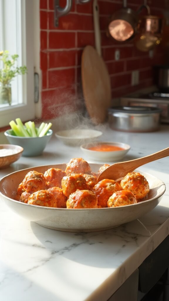 Heat for 2-3 minutes until fragrant. - Gently toss the meatballs in buffalo sauce.