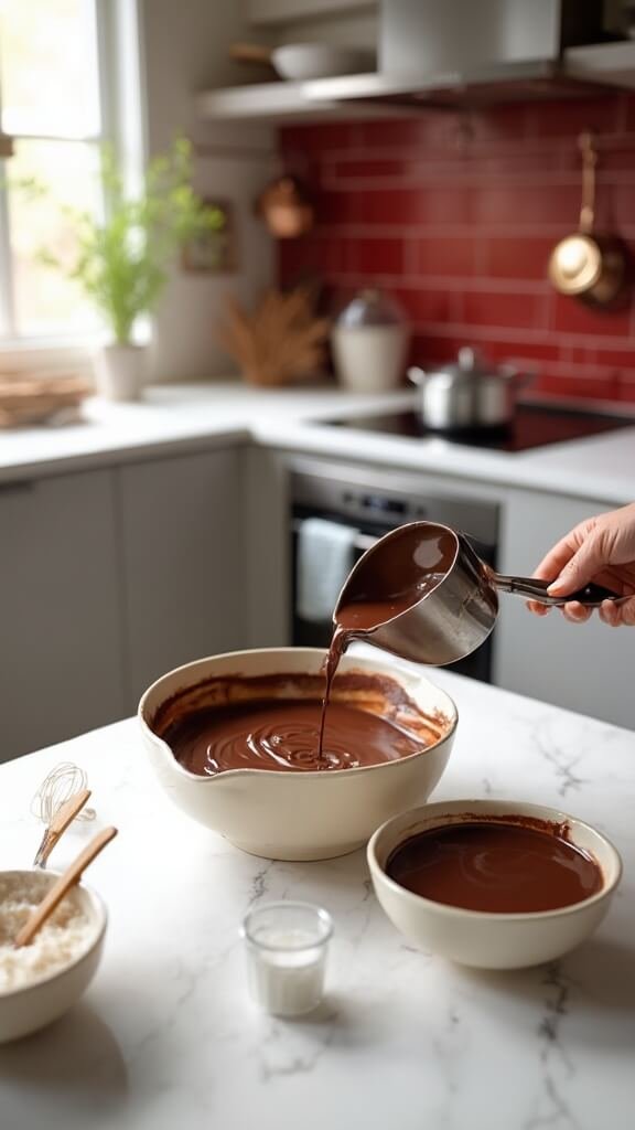 - Pour hot cream over melted chocolate mixture and let sit for 2 minutes.