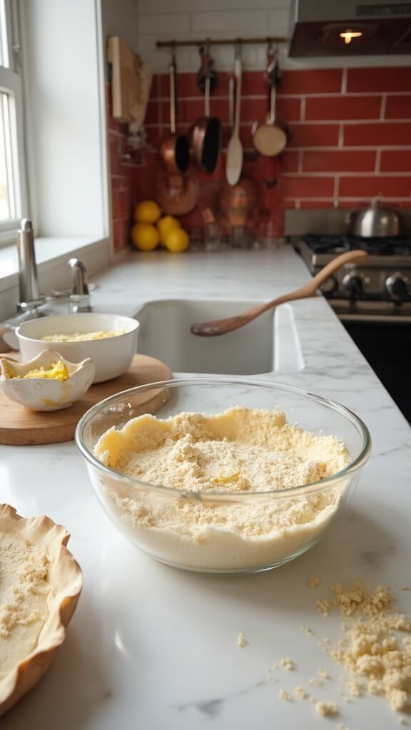 - Make the crust by combining almond flour, erythritol, lemon zest, and salt in a bowl. Pour in the melted butter and mix until it looks like wet sand.