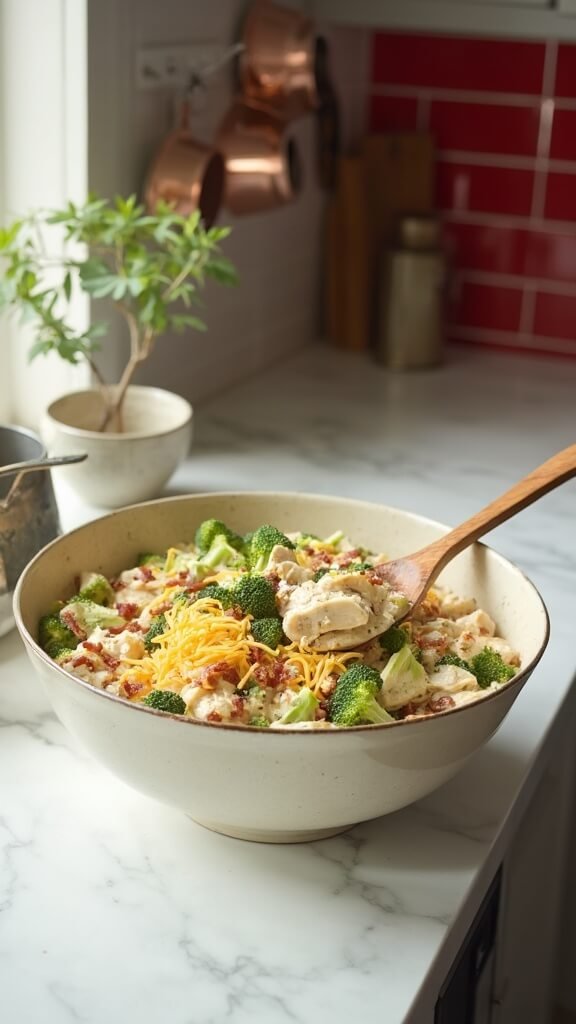 - Fold in the cubed chicken, most of the bacon (save some for topping), steamed broccoli, and 1.5 cups of cheese. Mix gently but thoroughly.